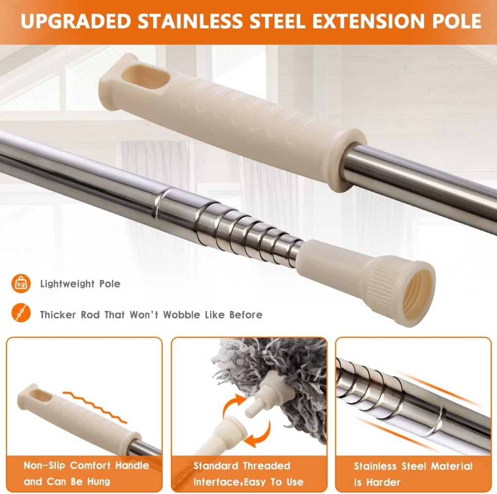 • EXTRA LONG EXTENDABLE : High-quality 100-inch long stainless steel telescopic pole, You don’t need take a risk to clean the high areas, use it and extend the length of duster pole you want from 30 to 100 inches.